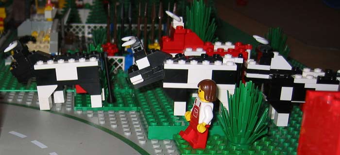 Eigentlich ist der Harms-Hof mittlerweile ein reiner Ackerbaubetrieb und die vier Kühe sind Heikes Hobby. Nur um den Dorfbullen Benno kümmert sich Hein. Die Herde ist eine reine Schwarzbunt-Herde, allerdings mit einem kleinen genetischen Ausreißer. Die Kuh Edda ist rotbunt, obwohl sie von einem schwarzbunten Vater und einer schwarzbunten Mutter abstammt. Hier hat Mendel mit voller Wucht zugeschlagen. (Stand 07.12.2002) |